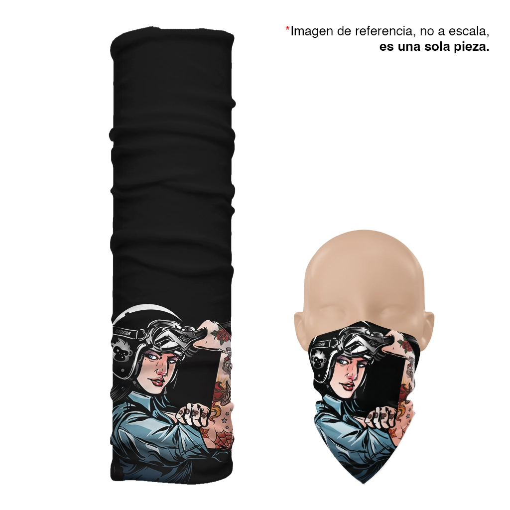 Sus costuras reforzadas aseguran resistencia, mientras su formato largo —con 90 cm de cobertura posterior— protege cuello, rostro y nuca. Si prefieres, puedes usarla como pañoleta suelta para un estilo más relajado sin perder su toque poderoso.