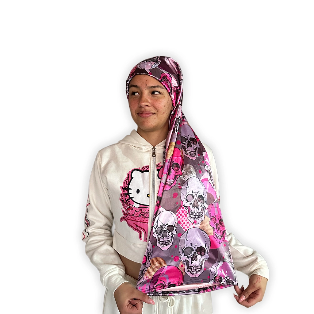 El cuello largo en satín Ride to Live lleva una estética marcada por las calaveras, el contraste y ese aire rebelde que conecta con la cultura motera y el imaginario memento mori. Es un diseño con fuerza visual, pero también con un lado expresivo y distinto, pensado para quienes prefieren piezas que no pasan desapercibidas. Además, su formato doble faz te permite elegir entre el estampado Ride to Live o un reverso rosado liso, más limpio y fácil de combinar.